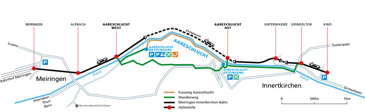 Hiking through the Aare Gorge from either the west or east entrances takes approximately 40 minutes. The return journey can be made via a hiking trail over the 'Lammi' Pass and takes around one hour. The Meiringen Innertkirchen train also enables you to do one part of the round trip by train.