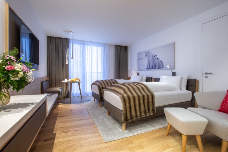 You will find that this is a very relaxing hotel for your holiday - you can enjoy the crisp, clear air while sipping freshly brewed coffee on the terrace, or finish off an evening with a glass of your favourite wine at the intimate BärBar. Breakfast is an inviting buffet and dinner is served in the elegant Spun restaurant, offering a modern take on regional specialties with local and seasonal produce. Both à la carte and half board (3 courses) options are available. After your day of exploring, you may like to spend some time in the hotel's Spa & Wellness Centre, complete with fitness facilities, a sauna, steam room, and pool with lovely views through the panoramic windows. Rooms are very comfortable and furnished to a high standard, with all modern conveniences. Superior rooms are slightly larger and are located on higher floors for even better views.