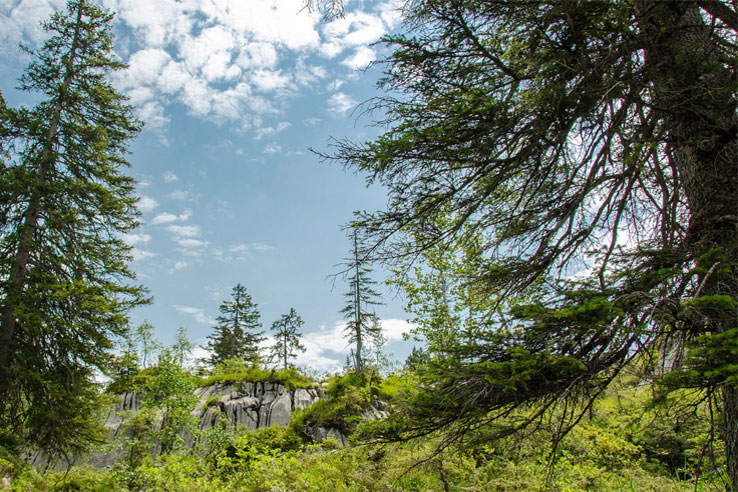 mountain karst, there are slim pines, willows and a dense, sub-Alpine spruce