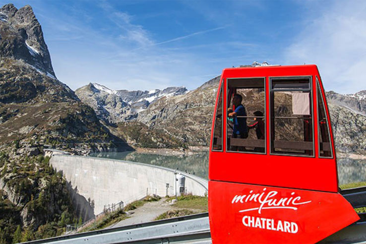 Le Châtelard This is the last stop in Switzerland before the border. It is well worth alighting for a visit to the VerticAlp Emosson Park - with the world's steepest two-cab funicular travelling on an 87% incline - and the impressive Emosson Dam. There are beautiful views across to Mont Blanc.