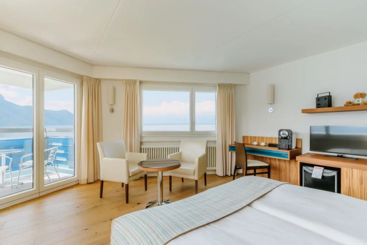 Rooms are comfortable and all benefit from a view over Lake Geneva. The fitness room also has inspiring views, or you could try cycling beside the lake or paddle boarding from the private jetty - both offered free of charge by the hotel.