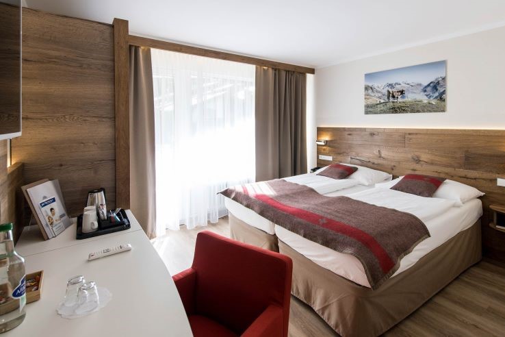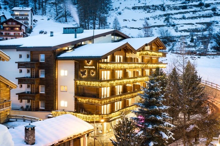 An excellent 3 star hotel in a quiet but convenient location for alpine excursions, being close to the Gornergrat mountain railway and the Sunnegga funicular. This very popular hotel is exceptionally well appointed and you will feel the warm ambience as soon as you arrive – the reception is next to the cosy lounge where guests can relax with a drink and a good book by the open fire. There is an attractive dining room where you will be served your four course dinner - the kitchen specialises in rustic Italian and Swiss cuisine - whilst breakfast is laid out as an ample buffet. Every afternoon, Butterfly guests are invited to enjoy afternoon cake with a welcome tea or coffee. There is also a charming piano bar which leads off the lounge. Other facilities include a sauna and relaxation room. All double/twin rooms have a balcony for you to admire the splendid view of the Valais Alps.