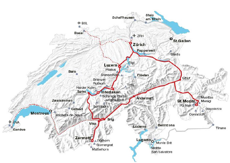 3 nights each in Lucerne and Interlaken, 2 nights each in Brig and Chur