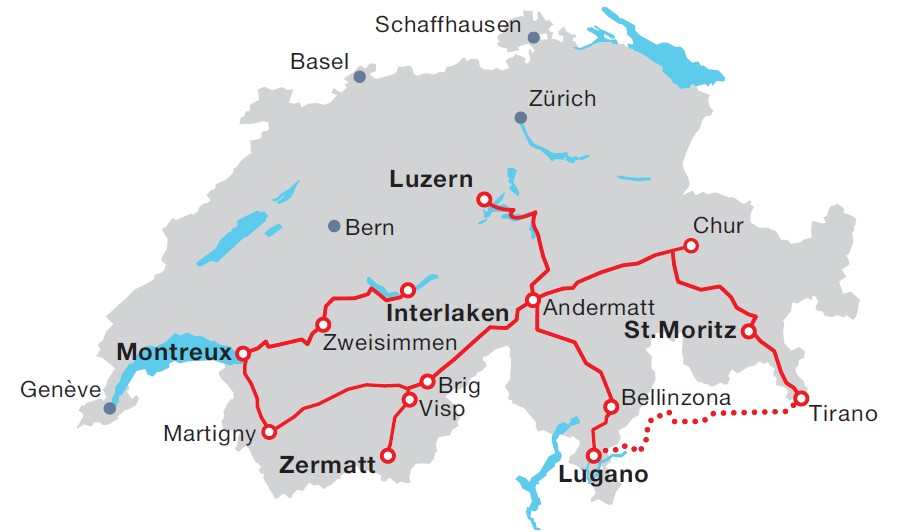 Your holiday includes a Swiss Travel Pass, covering the rail journeys below as well as many scenic excursions