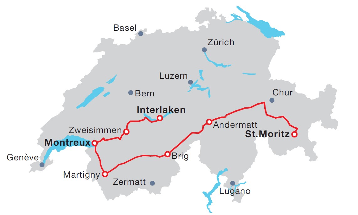 5 nights in St. Moritz, 4 nights in Montreux and 5 nights in Interlaken