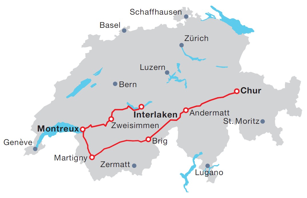 • Reserved seats and set lunch (drinks can be purchased on board) on the Glacier Express Chur-Brig. Regional rail Brig-Montreux (all 2nd class)