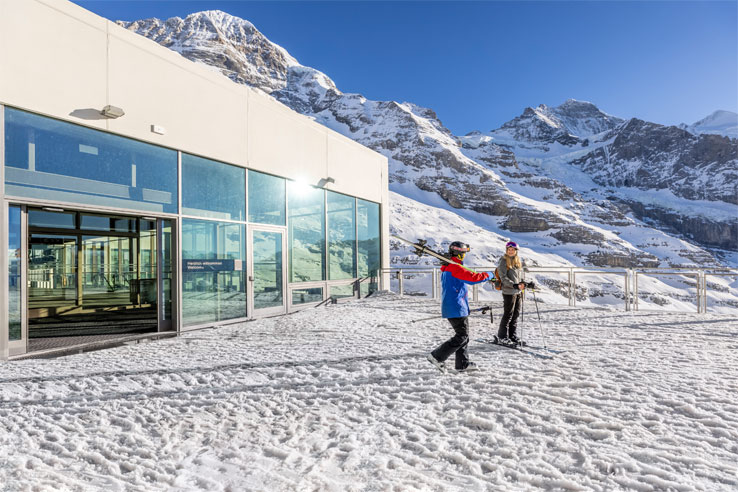 Grindelwald holidays benefit from the village being located at the heart of the ambitious V-Cableway. This multi-million state of the art transportation system makes skiing in the Jungfrau mountains better than ever! The valley terminal is easily reached and boasts shops to cater for all your skiing needs as well as souvenirs and snacks. From here, the 10 seater gondolas take you up to the Männlichen at 2,225m in just 19 minutes: 11 minutes quicker than the previous cable car service, with double the capacity. The other 'arm' of the V cableway is the Eiger Express. The 26 seater cabins travel from Grindelwald to the Eigergletscher station - including close up views of the north face of the Eiger - in just 15 minutes. The seats are even heated for your comfort! From the Eiger station, with its amazing panorama viewing hall, you can ski directly to the Wixi chairlift and then on to the world-famous Lauberhorn run: the longest race track of the Ski World Cup. Alternatively, you can take the connecting train from the Eigergletscher to visit the Jungfraujoch-Top of Europe at 3,454m.Â